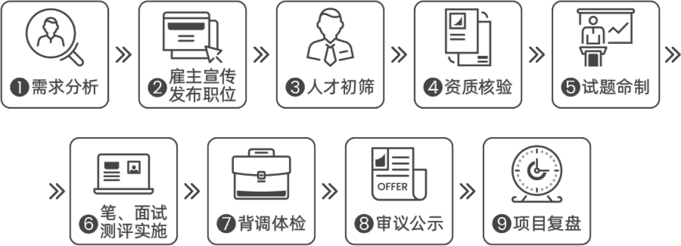 基于专业化公招报名系统平台,汇集多元化人才渠道资源,为客户给予市场化人才选聘的全流程服务,包含招聘前期调研、雇主宣传、人才筛选、资质核验、笔试、面试、测评、背景调查、体检、入职跟进等。